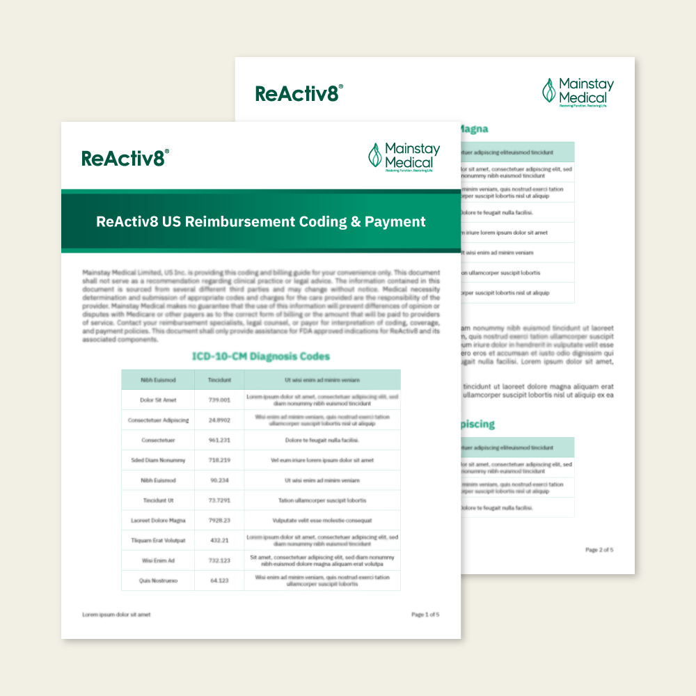 Contact your reimbursement specialists, legal counsel, or payor for interpretation of coding, coverage, and payment policies. This document shall only provide assistance for FDA approved indications for ReActiv8 and its associated components. Click to view and download.