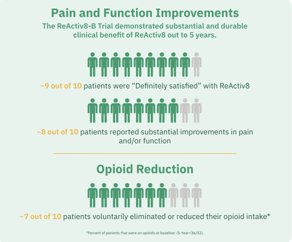 Most patients using ReActiv8 experience steady, long-term improvements in both pain and function. This has been demonstrated in 5 separate clinical studies, with 567 patients, and over 1,800 years of patient follow-up.