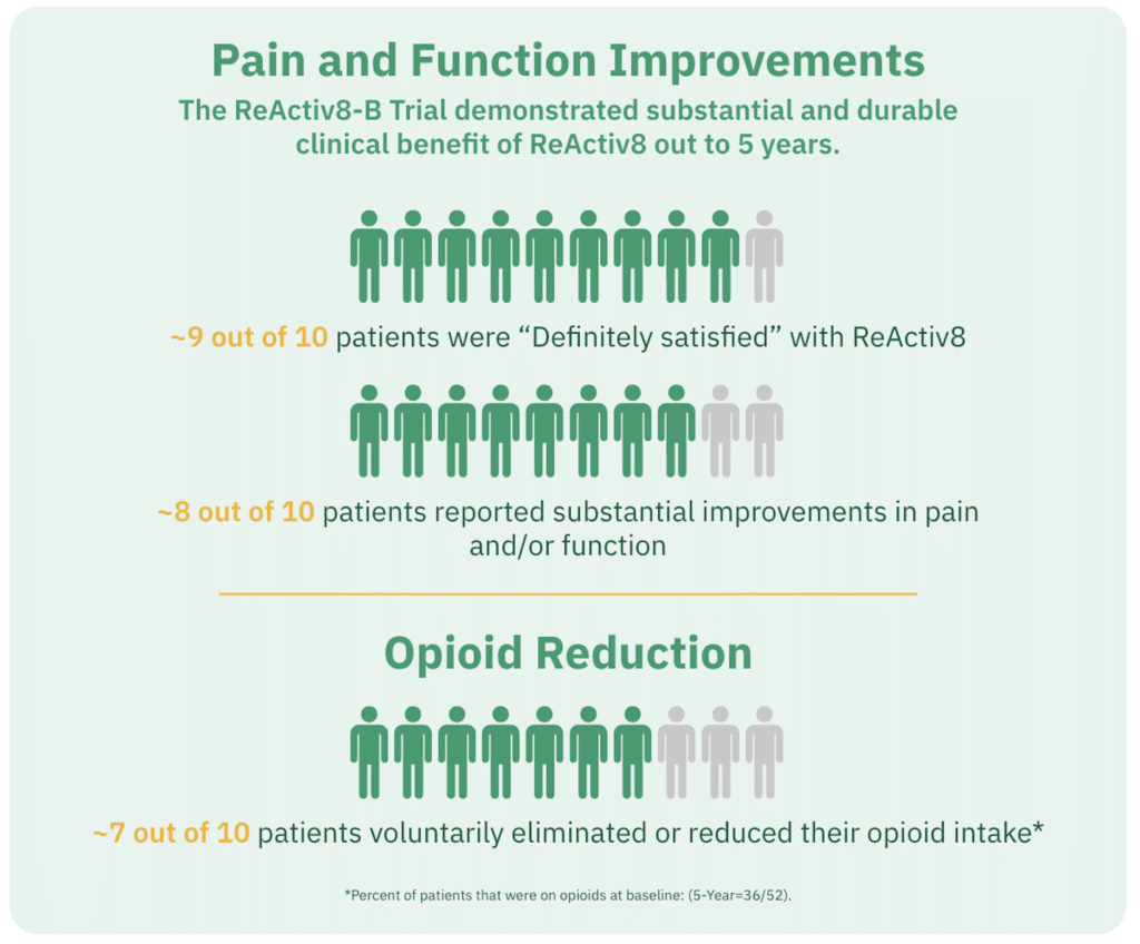 78 % der Patienten, die an der ReActive8-B-Studie teilgenommen haben, gaben nach einem Jahr an, dass sie mit der Behandlung „durchaus zufrieden“ waren. Insgesamt gingen bei 64 % der Patienten die Schmerzen um die Hälfte oder mehr zurück, und bei 73 % der Teilnehmer verbesserte sich der Schmerz und/oder die funktionelle Einschränkung um 50 %. Die Ergebnisse der klinischen Studie finden Sie in dem veröffentlichten Manuskript im PAIN Journal. [1]