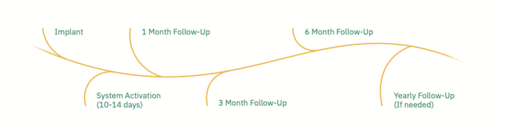Your wound will be checked 10-14 days after surgery, and your stitches will probably be removed. At this follow-up, your system will be activated, and you’ll learn how to use it and run therapy sessions. It’s important to avoid strenuous activities for the first 4-6 weeks to let the system heal properly.