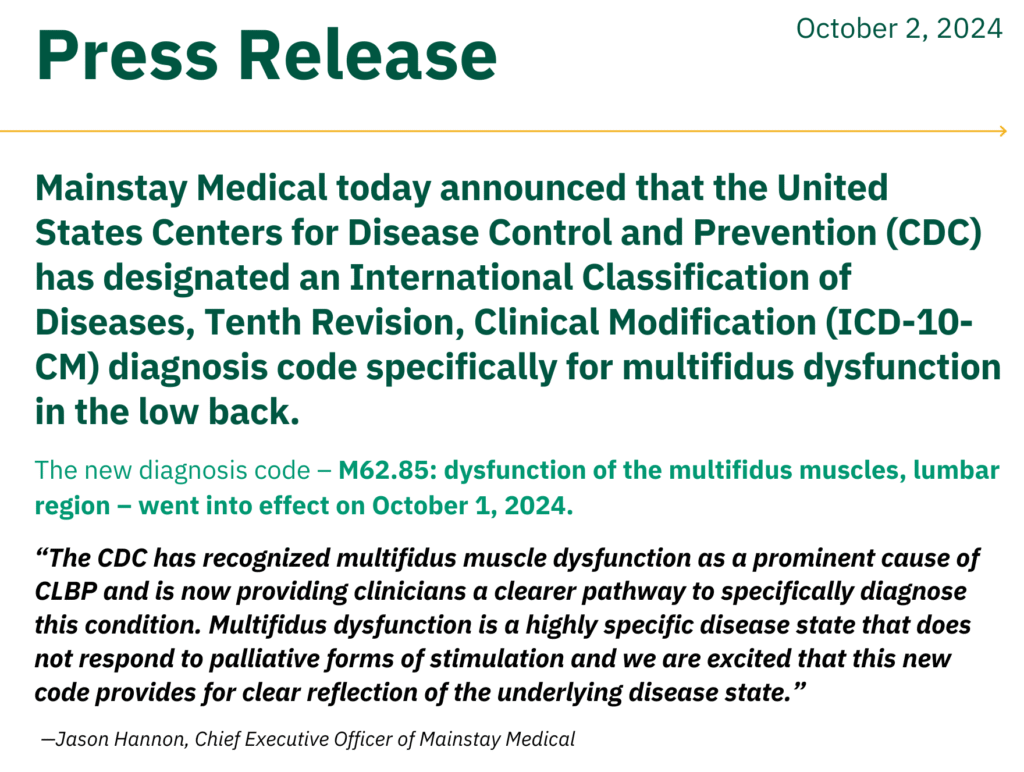“The CDC has recognized multifidus muscle dysfunction as a prominent cause of CLBP and is now providing clinicians a clearer pathway to specifically diagnose this condition. Multifidus dysfunction is a highly specific disease state that does not respond to palliative forms of stimulation, and we are excited that this new code provides for clear reflection of the underlying disease state,” stated Jason Hannon, Chief Executive Officer of Mainstay Medical.
