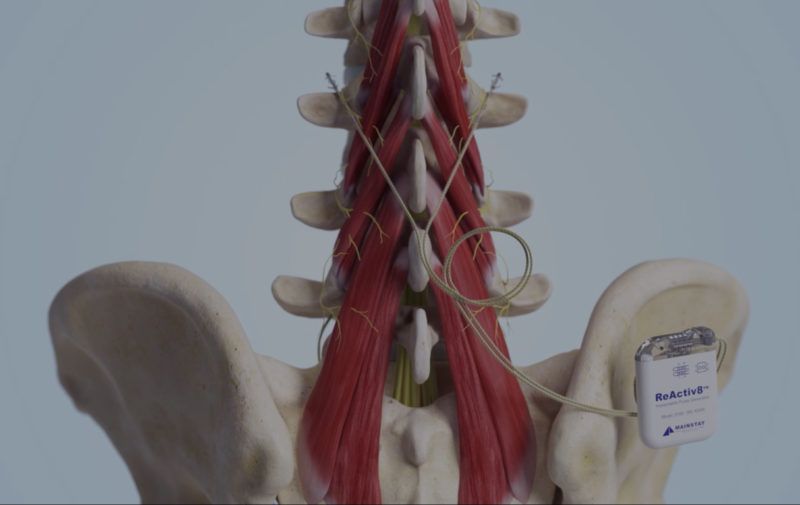 ReActiv8 is implanted underneath the skin during a minimally-invasive outpatient procedure. A generator is connected to two electrical leads, which are positioned to stimulate the nerves that control the multifidus muscle.