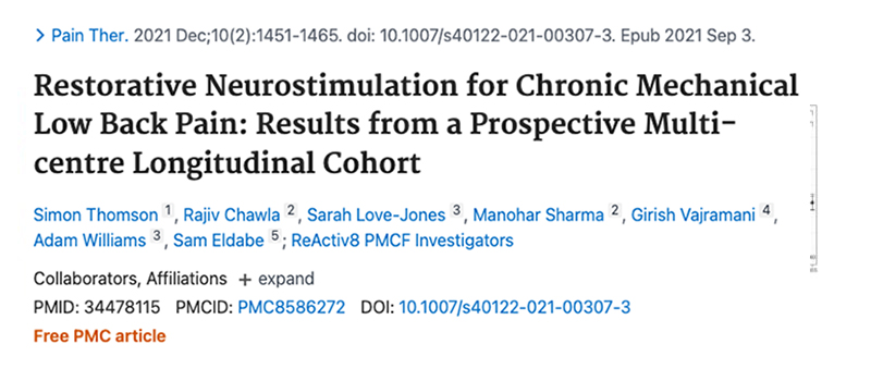Restorative neurostimulation for CLBP is supported by several clinical studies that show robust and durable clinical effects over the pretreatment condition.